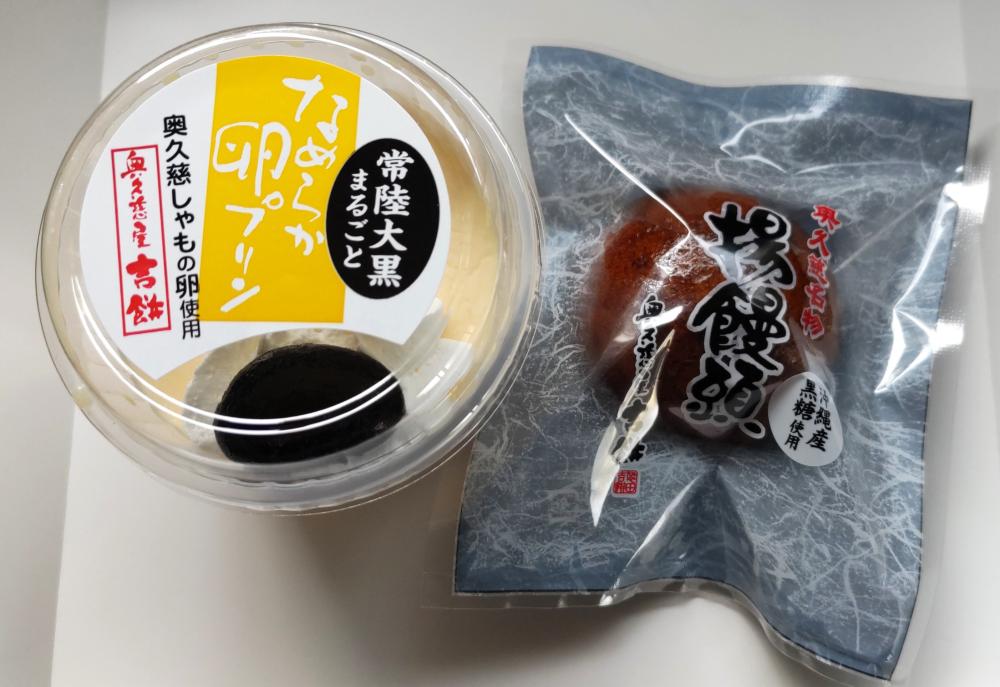 「大黒なめらか卵プリン」と「常陸大黒揚げ饅頭」を購入しました。 奥久慈しゃもの卵を使ったプリンには、常陸大黒の豆が1粒、ホイップクリームとともにのっています。プリンはなめらかな食感で、豆もおいしかったです。(350円) 揚げ饅頭は、黒糖を使った皮の中に、常陸大黒と小豆を使ったこし餡が中に入った、おいしい饅頭です。(130円)
