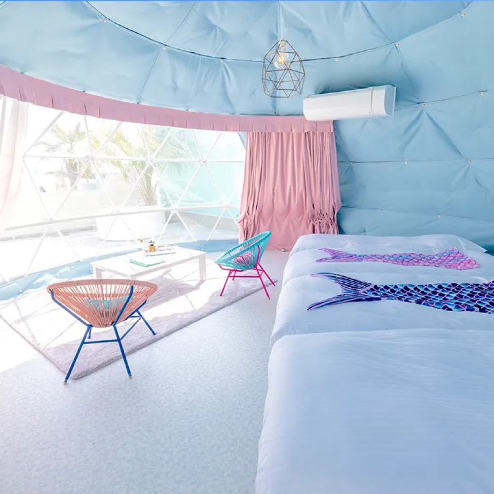 2022年3月にオープンしたばかりのグランピング施設。全15棟、4種のお部屋からお気に入りのグランピング棟が選べます。ヨガやサウナ、キャンプギアの無料レンタルなど、体験型のアクティビティも充実しており、従来のキャンプとは異なる楽しみ方ができるのもポイント!さらには、全客室エアコン完備&個別のトイレ・お風呂&アメニティ完備だから、小さなお子様も女性も安心して過ごすことができますよ♪