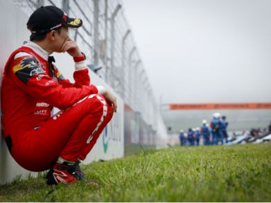 レース後、壁によりかかりうずくまる野尻選手…。優勝が見えない状況に困惑…