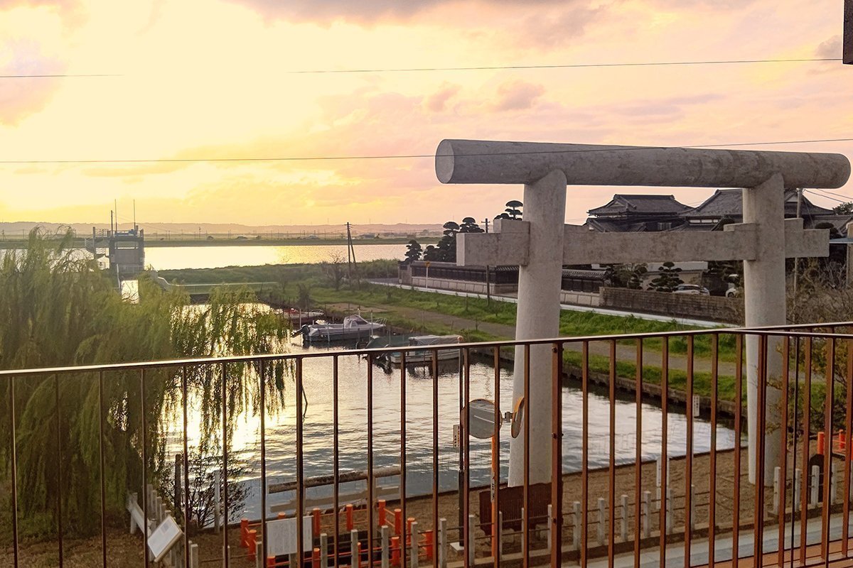 一の鳥居や船だまり、常陸利根川に臨む「眺望テラス」夕暮れ時がおすすめ。川に沈む夕日はフォトジェニックな絶景です。