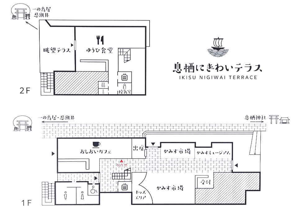 息栖にぎわいテラスの構内図。1階には市場やカフェ、2階には食堂や眺望テラスがある