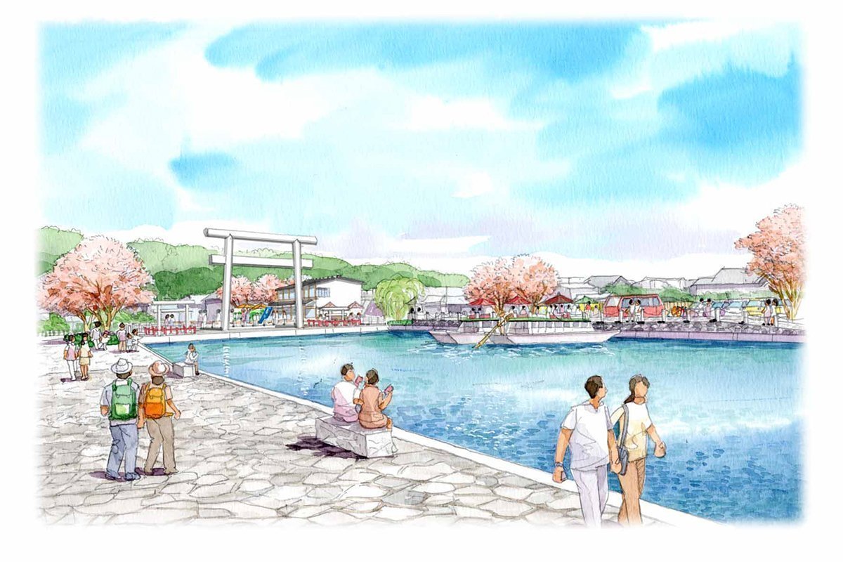 参道と水辺を結ぶ「にぎわい広場」。散策や憩いの場として整備されている