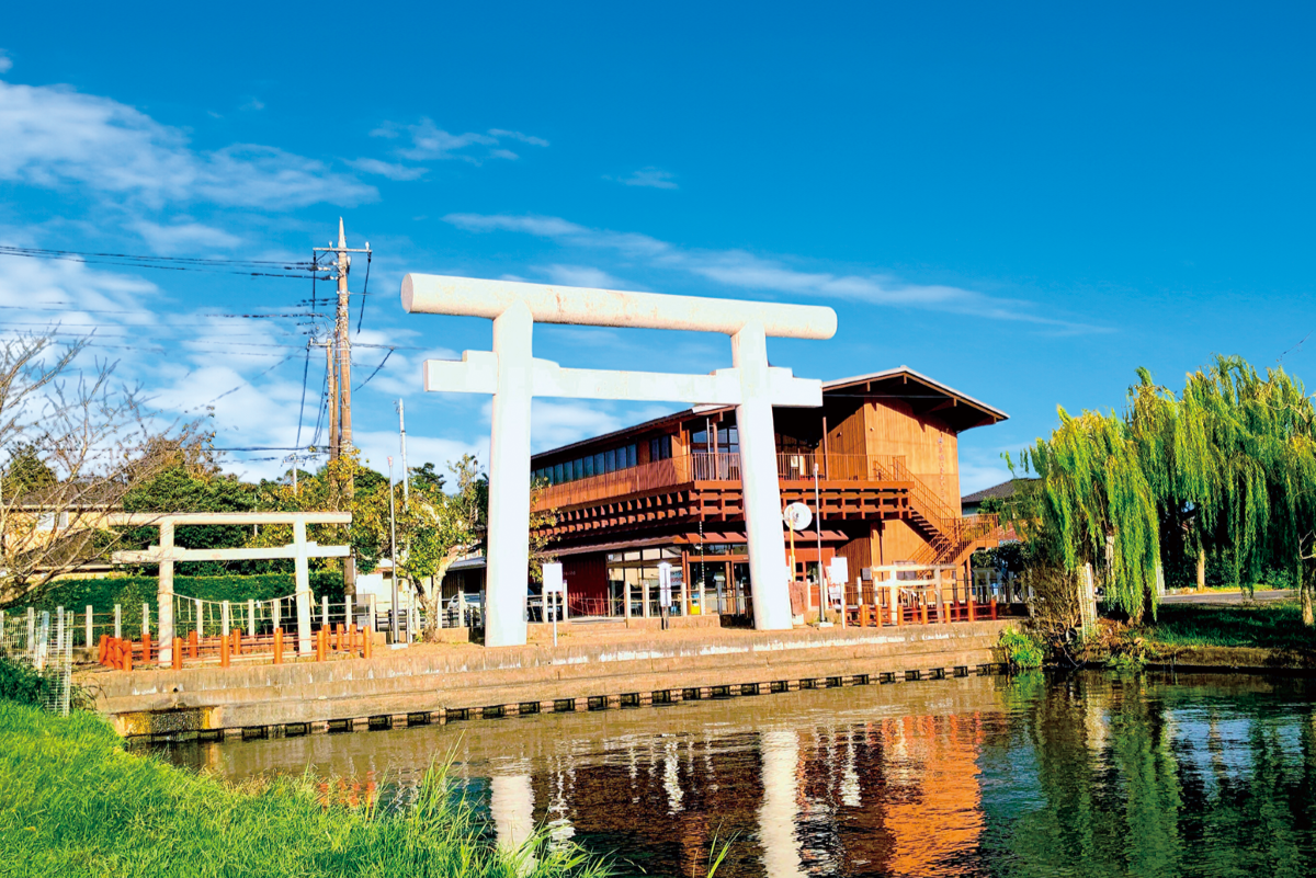 息栖神社を象徴する「一の鳥居」と、参道沿いに佇む息栖にぎわいテラス。歴史ある景観と調和する落ち着いたデザインが魅力