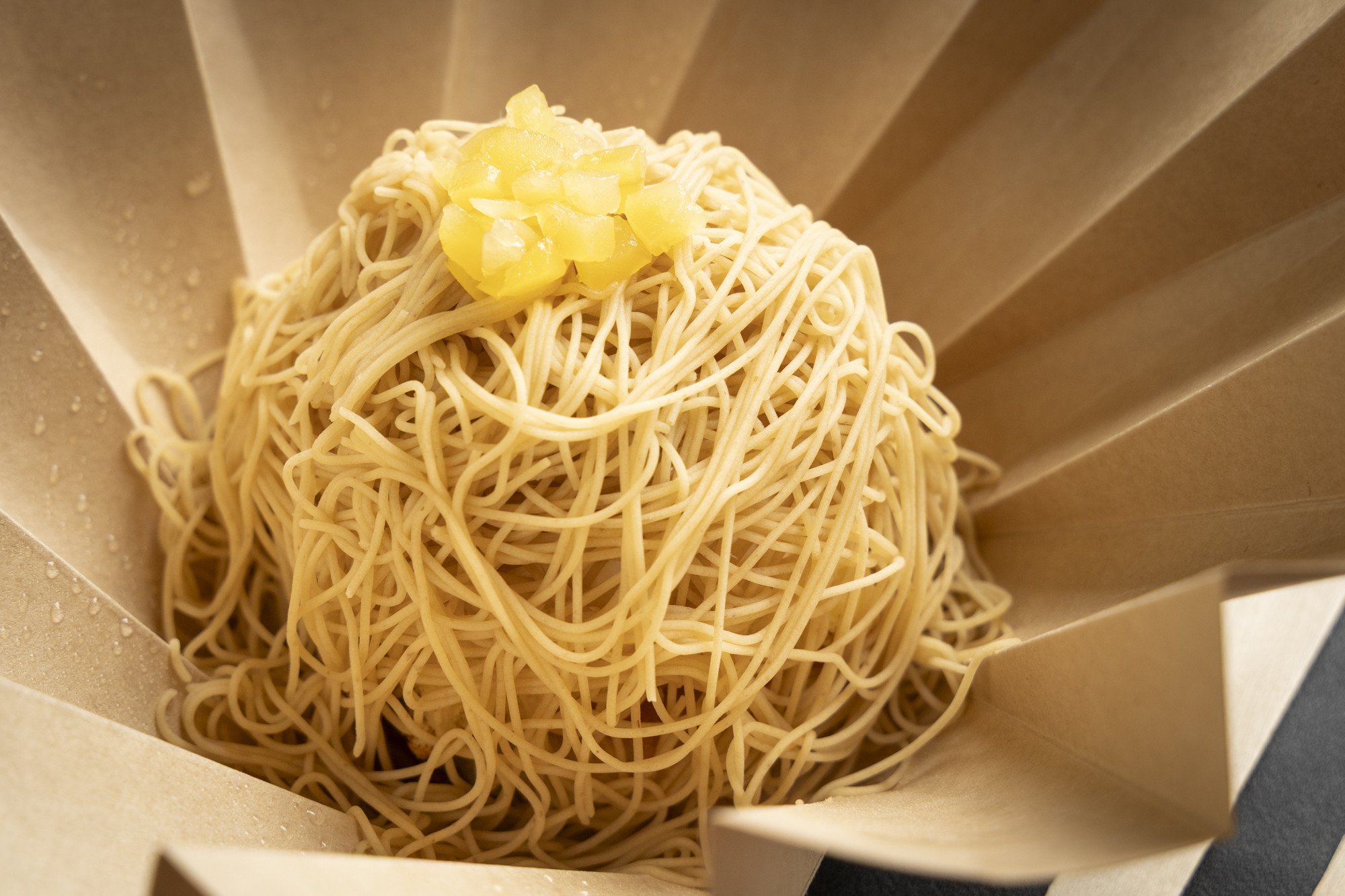 「楽栗La Kuri」は、道の駅かさまにある自社無農薬の笠間栗を使ったスイーツ店です。おすすめは、イタリア語で“糸”を意味する名をもつモンブラン『フィーロ』(880円)。空気を含んだマロンクリームは、安定した味を楽しめるよう糖度を17%に調整。やさしい甘さと栗の香りが広がります。中の栗ペースト入り生クリームと絡むと濃厚な味わいに。さらに、添えられたシーソルトを加えると栗の甘さが引き立ち3つの栗の味の変化を楽しめるも魅力。古内茶と合わせれば、栗とお茶の香りが絶妙に調和します。