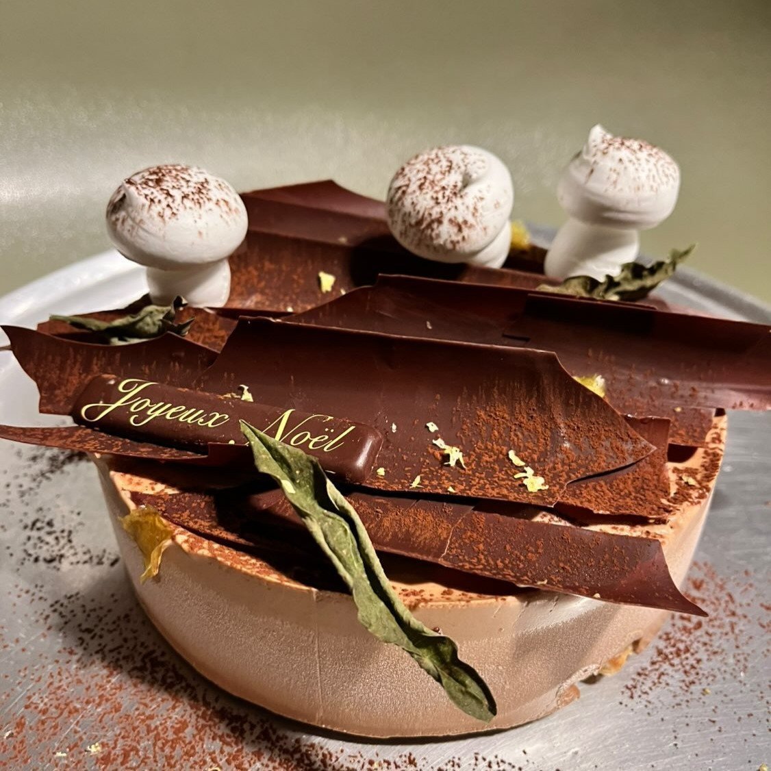 濃厚なチョコムースに爽やかなレモンクリームを合わせ、香ばしいナッツと可愛らしいキノコのメレンゲが彩ります。