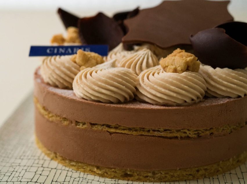 スパイス香るバナナジュレとカフェオレクレームを、キャラメルショコラのムースがやさしく包む上品なスイーツ