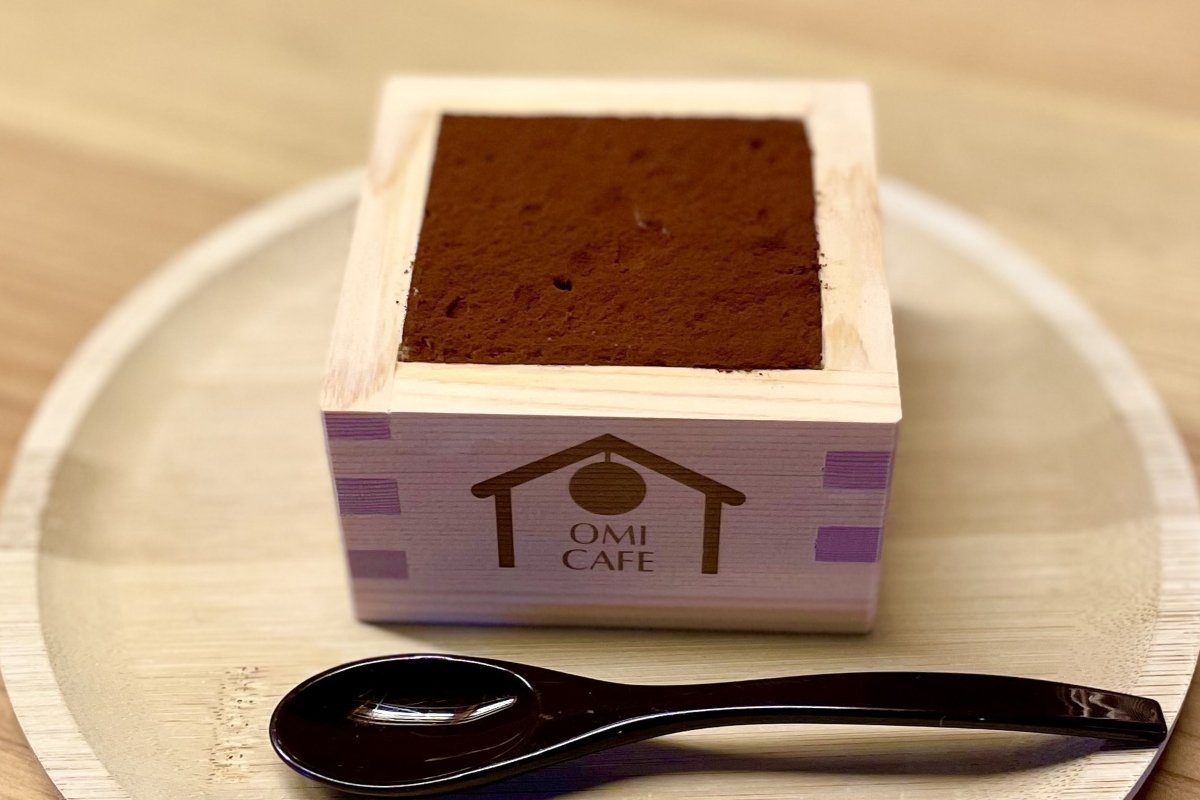 酒粕のコクと柿の甘みが重なり合う、秋の人気デザート。OMI CAFE限定の枡は持ち帰りもできます♪