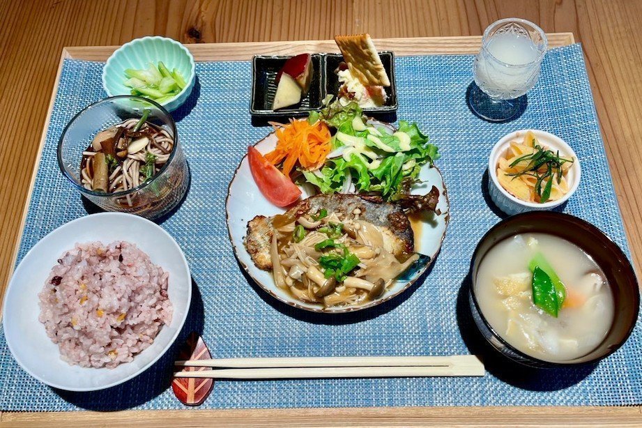 月替わりプレート。やさしい塩麹の旨味と、きのこの香りがふんわり広がる秋限定ランチ。旬の小鉢・ミニ蕎麦・酒粕汁・ひとくち甘酒付きです。