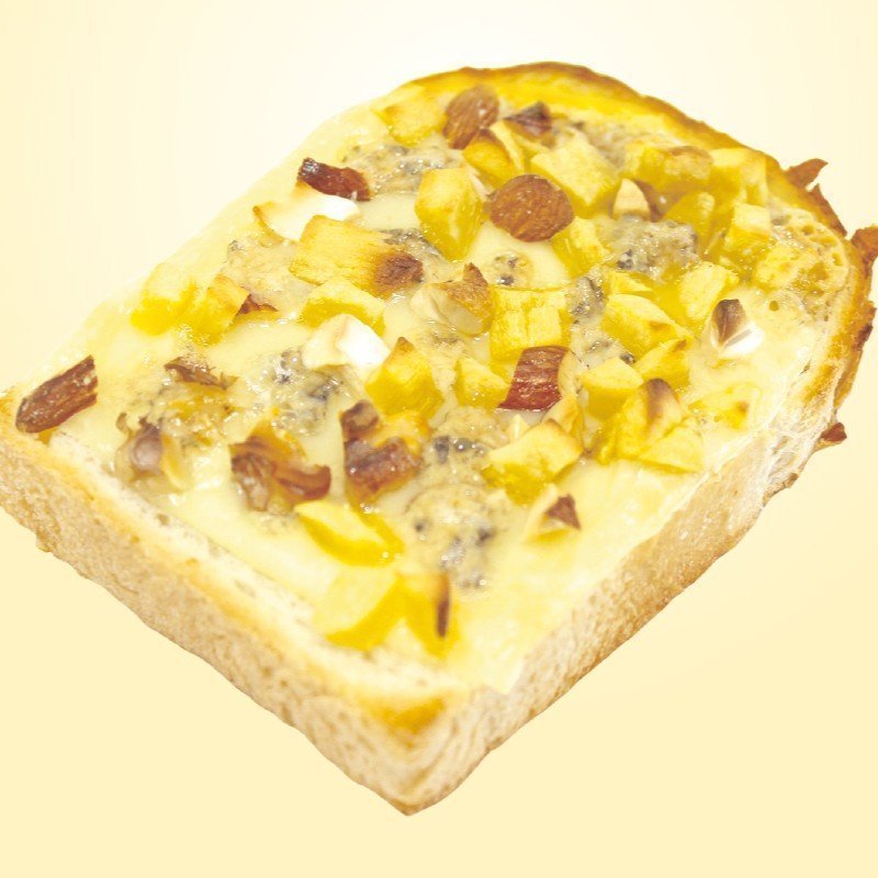 1. パンにほしいもを並べ、チーズとナッツをのせる。