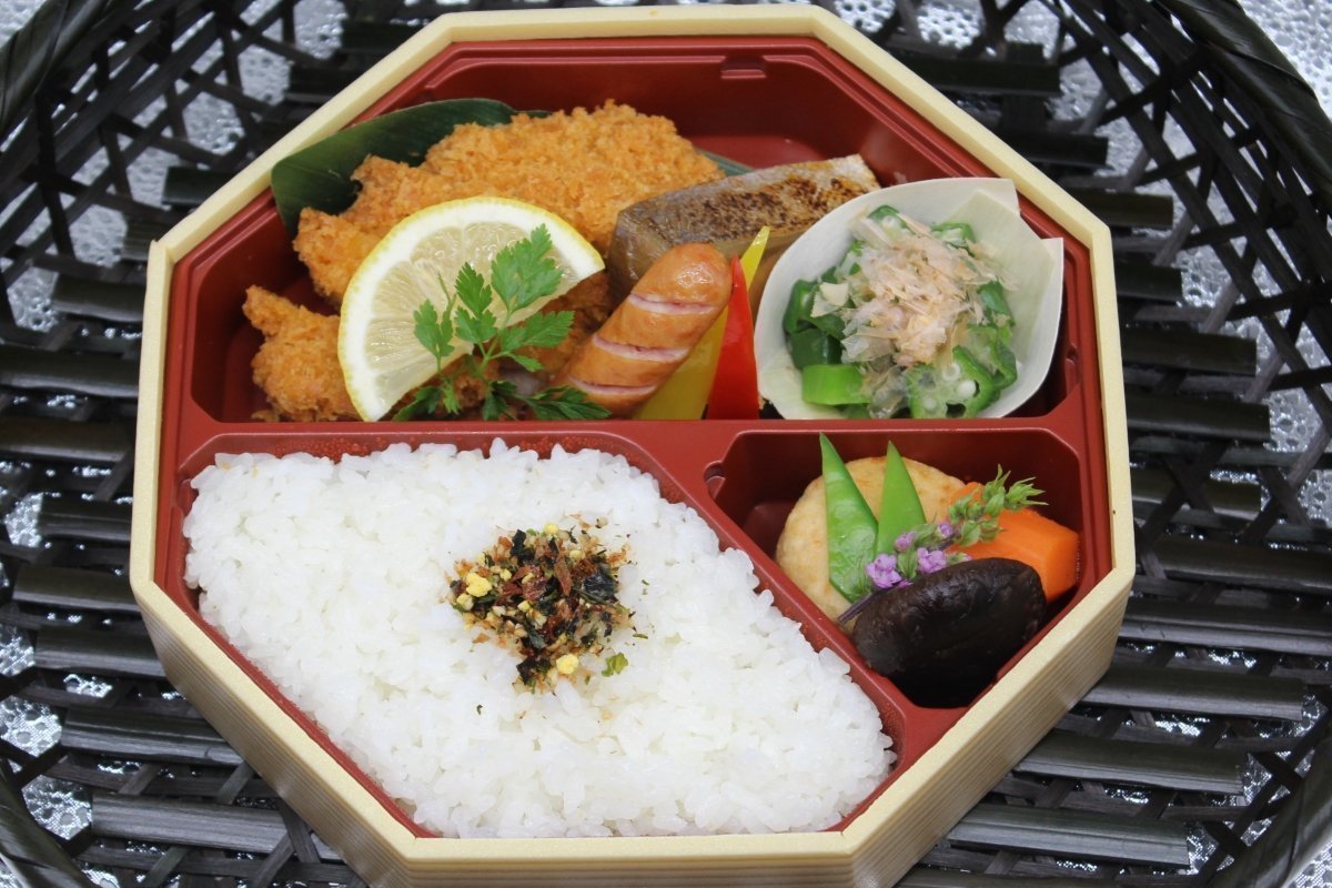 勝彩弁当 1,058円(チキンカツ、ぶりの照り焼き、あらびきウインナー、オクラのおひたし、煮物の多喜合せ)