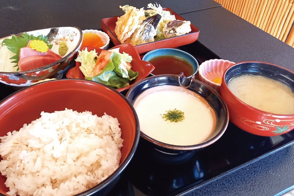 麦とろご飯に本まぐろの刺身、野菜の天ぷらが付いた豪華御膳。他にも大和いもコロッケやお蕎麦が付いた御膳などもあります。