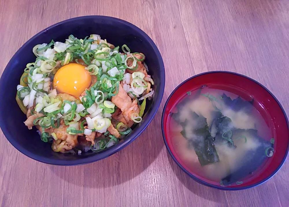 久しぶりに平日昼に再訪し、今月から販売開始となった「熟成背脂黒すた丼」を並盛で注文しました。コク旨背脂に熟成黒ニンニク醤油ダレが特徴とのことで、脂量は通常のすた丼の2.5倍、ニンニク量は9倍とか。やはり生卵1個とワカメ・ネギの味噌汁も付いて来ます。生卵を割り混ぜ、丼の真ん中に流し込んで食します。やや大きめにカットされた背脂が豚バラ肉と刻みタマネギに混ざってゴロゴロしており、ニンニクの香りと味わいの強い味付けが実に美味しい。また肉と下の白飯の間には海苔が敷いてあります。並盛ながら十分に満腹となりました。
