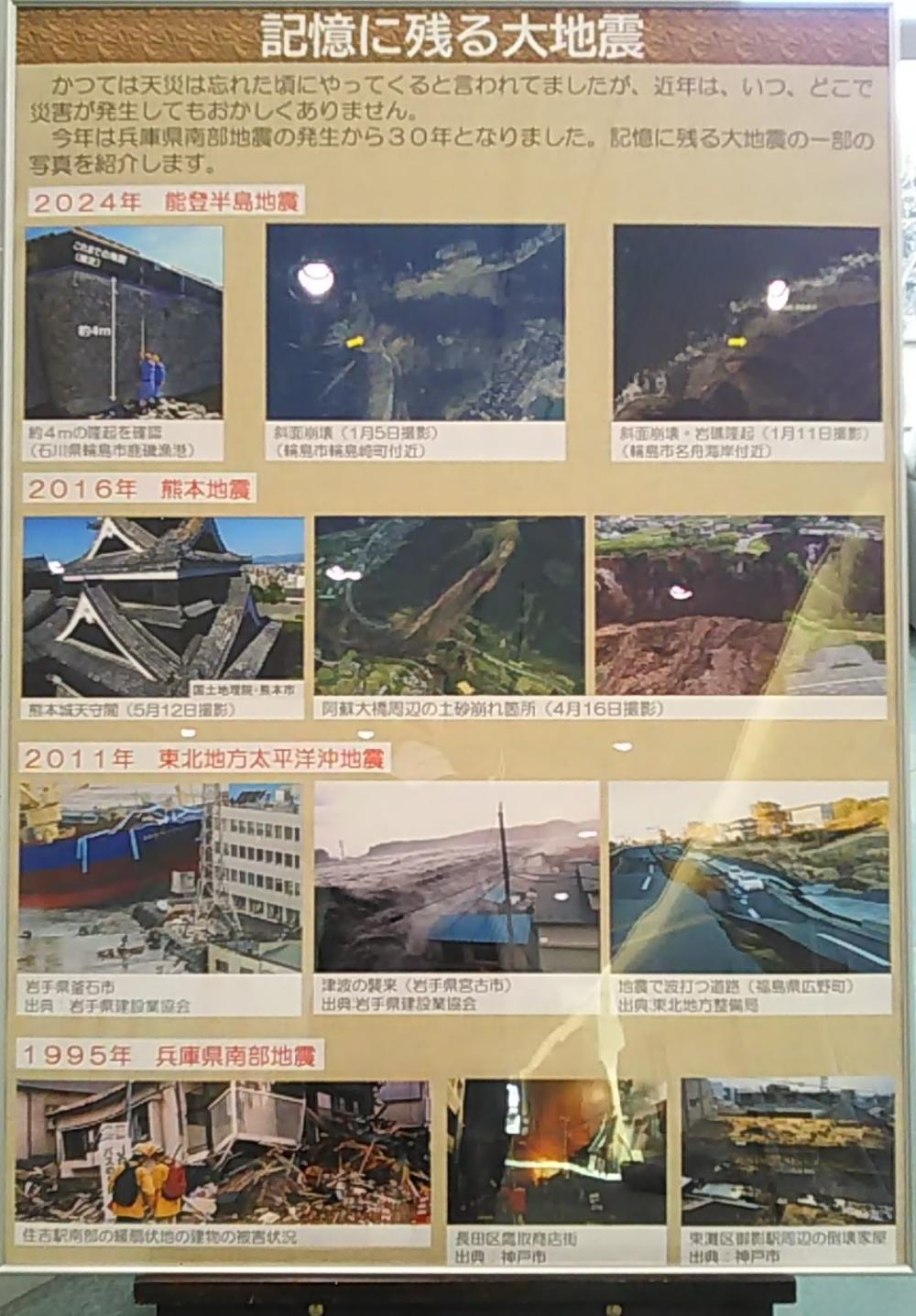 今月上旬の日曜日、こちらの企画展「国土地理院と防災」を見学しました。今年は平成7年兵庫県南部地震(阪神・淡路大震災)から30年と言う節目の年であり、またそれ以降も大きな自然災害がたびたびあったこともあっての企画展なのでしょう。展示室前には「記憶に残る大地震」のパネルが象徴的に掲げてあって、これまで直接・間接に経験した大地震の概況を思い起こすことができました。展示室には大地震ばかりでなく、これまでに起こった大規模な火山噴火(平成26年御嶽山噴火、平成27年口永良部島噴火、平成30年霧島山噴火)や風水害(平成27年常総市水害(鬼怒川決壊)、令和元年東日本台風)の被害状況も展示しています。併せて、発災のたびに被災状況や地殻変動の規模等を、空中写真撮影や電子基準点、観測技術衛星等により迅速に観測・分析する国土地理院の活動も紹介されていました。さらに地震や火山噴火の発生の仕組み、水害発生の背景となる日本特有の河川地形の特徴等に関する解説展示により、改めて自然災害についての認識を深めることができました。