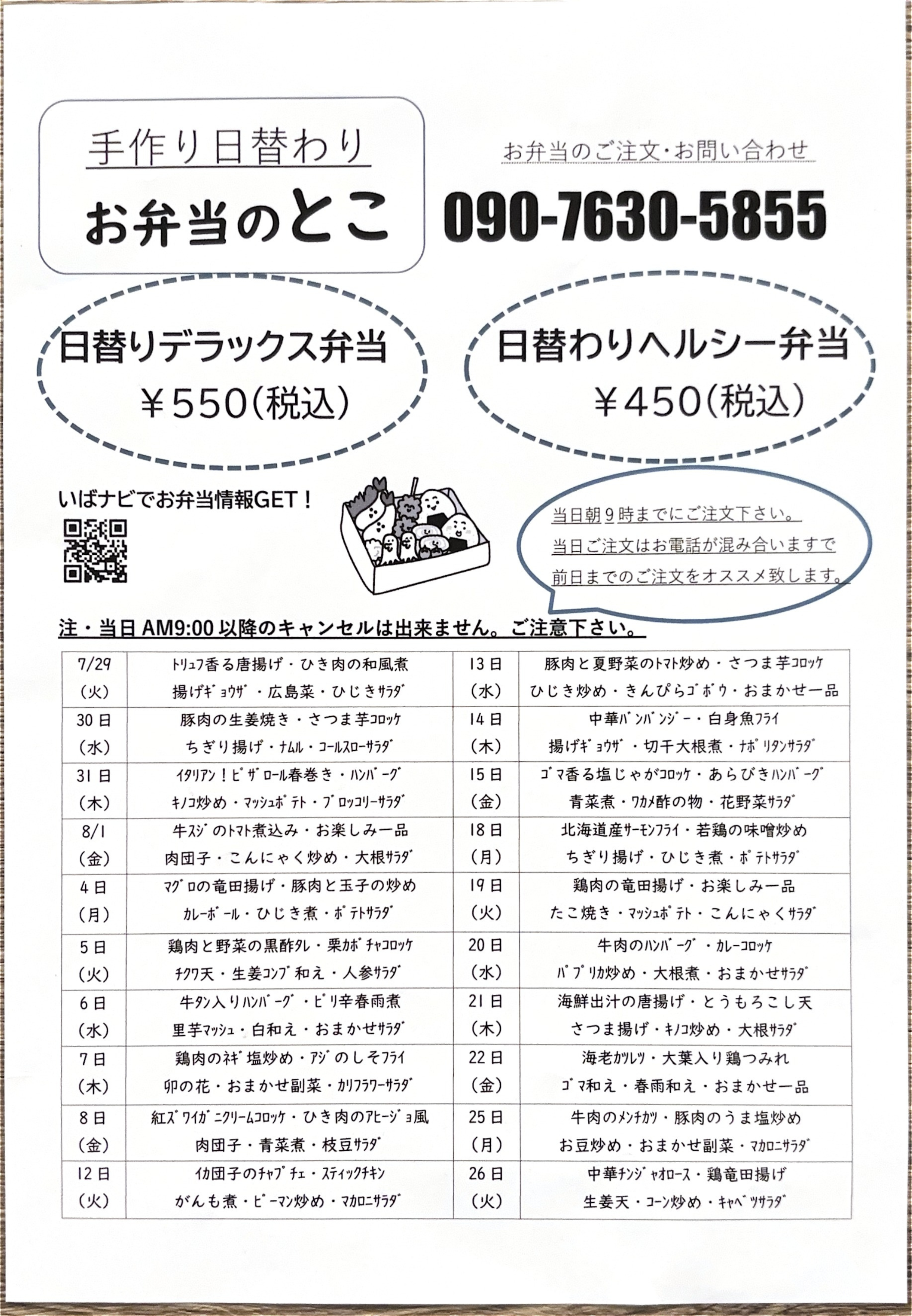 ―*手作り日替り弁当*― 店舗でも販売してますので、お気軽にどうぞ♪ 《配達注文のご注意》 当日朝9時までにお電話ください。 ※当日ご注文はお電話が大変込み合います。前日または、なるべくお早めの時間までにご注文をおススメいたします。 ※当日ご注文後のキャンセルはできません。ご注意ください。 【お弁当について】 ○電子レンジで温められます ○「十六穀米」を使用しています ○+20円でお味噌汁つきにできます ○お弁当はカロリー計算をしています ○ニンニクを一切使用しておりません ◆会議等のお弁当、オードブルも承ります!! 【お弁当注文・お問合せはこちら】 090-7630-5855