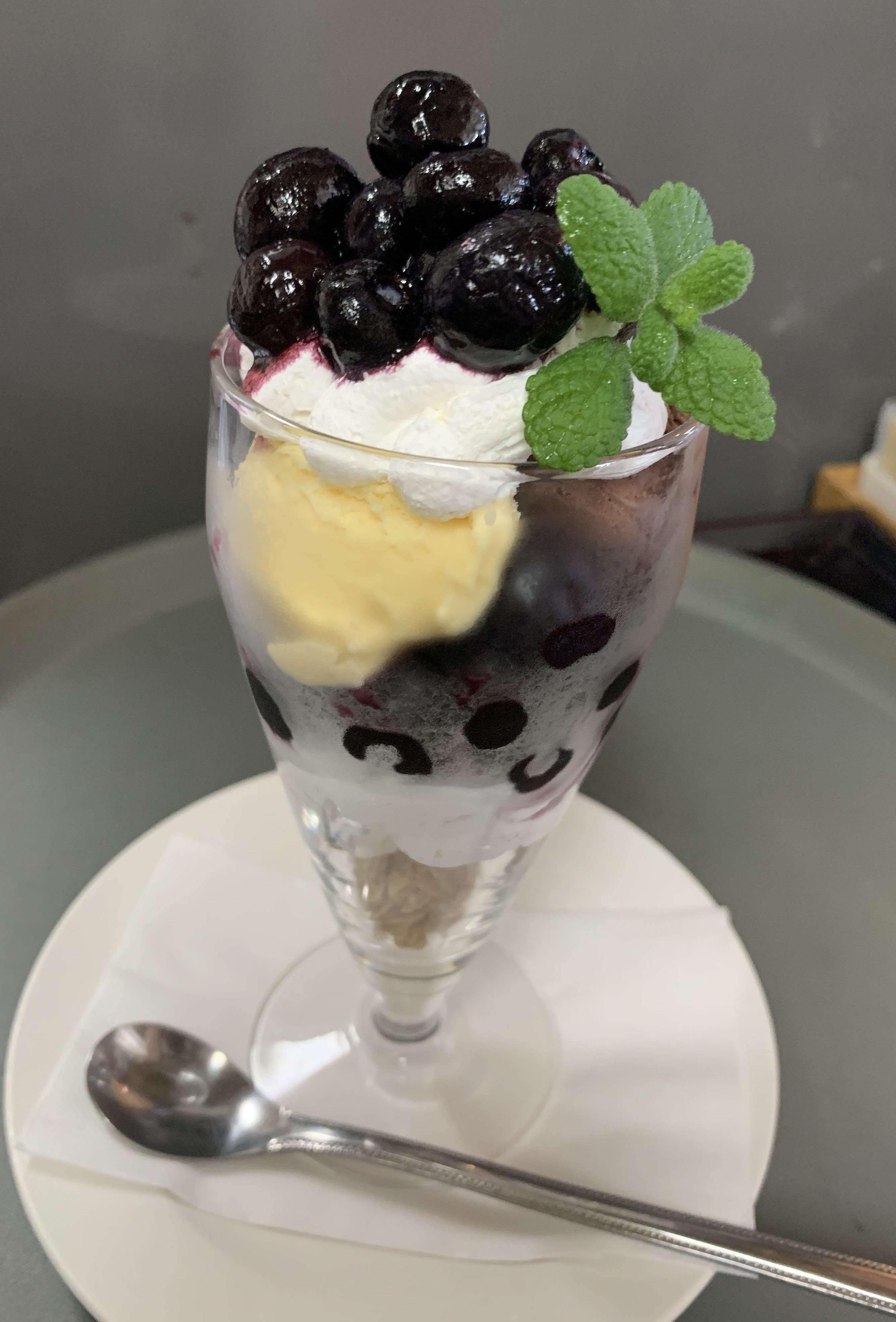 ■ケーキ ・ブルーベリーチーズタルト フルーツ添え 605円 *ケーキとドリンクセットで990円 ■パフェ 各935円 ・ミックスベリーパフェ ・ブルーベリーパフェ(写真) ・マンゴーパフェ ・チョコバナナパフェ ・ミニパフェ 638円 *ミニパフェとドリンクセットで1,045円 ************************** ・コーヒーゼリーフロート 770円 ・わらび餅 黒蜜、きな粉 605円 ※全て税込