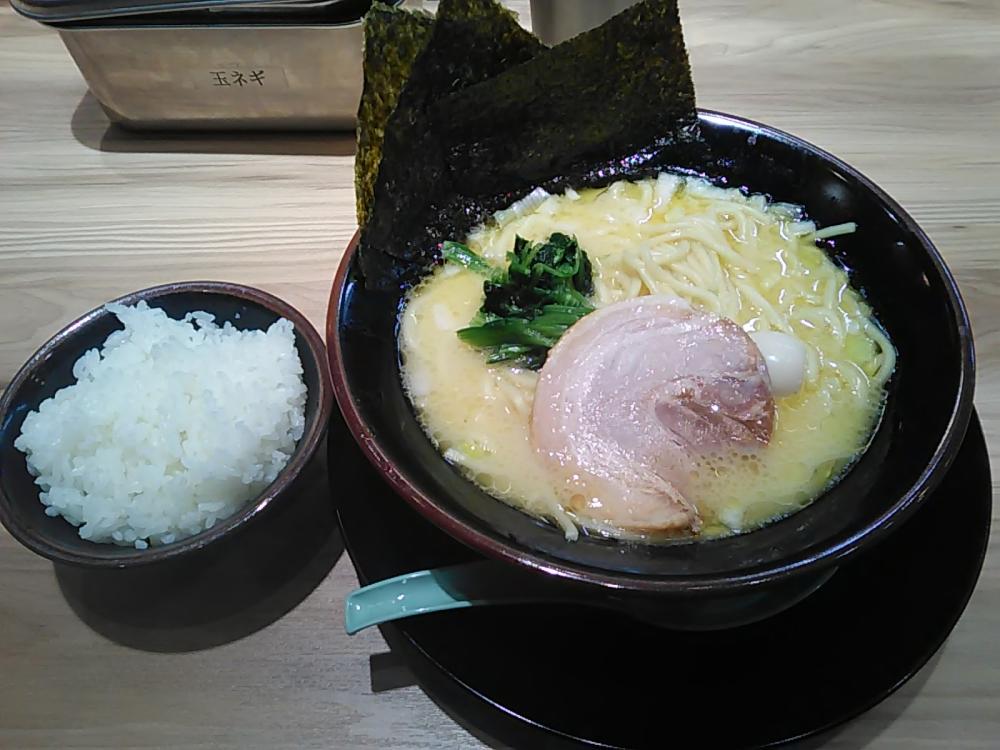 11月初旬の平日昼に訪れると、「茨城タンメン カミナリ」から「横濱家系ラーメン たくみ家 ひたち野店」に店変わりしており、数本の開店祝いの花輪が目立っています。店内もほぼ満席と盛況。券売機で「塩ラーメン」を選び、またJAFカード提示でお替わり自由のライスがサービスされました。到来した丼は小ぶりで、綺麗な淡黄色の豚骨塩白湯に中太麺が浸っています。麺上の具は約4mm厚の豚バラ巻叉焼1枚、板海苔3枚、ホウレンソウに刻み白ネギ。カウンター上には追加トッピング用の刻みタマネギや生姜、豆板醤、ニンニクの壺も完備し、途中で好きなだけ投入しました。豚骨塩白湯はトロリとして特有の甘味も強く感じられ、実に美味しい。ライスは別コーナーにあるジャーから装い放題です。麺はあっと言う間に完食し、ライスと合わせて満腹となりました。帰りにはトッピングクーポン券ももらったので再訪あり。