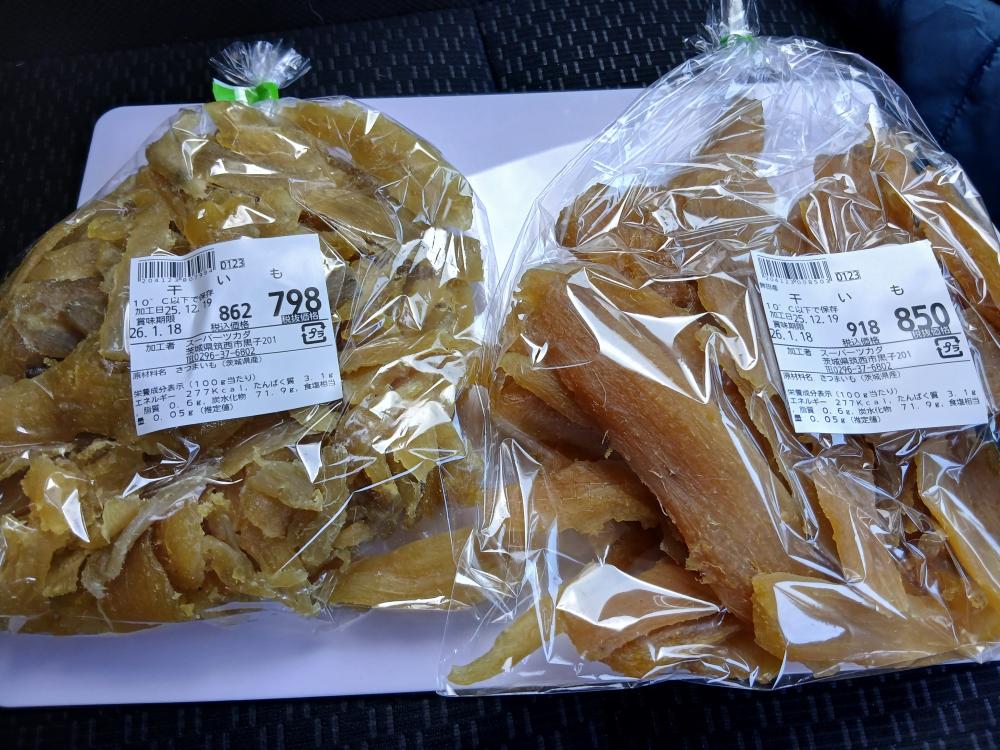 前回同様、筑波山に行ってから、帰りに買いに来ました。茨城県の人は、干しいもが好きだと、テレビで言っていましたが、まとめて5袋を買って行く人もいました。今回は、やはり切れ端で2袋買って来ました。しばらく食べられそうです。