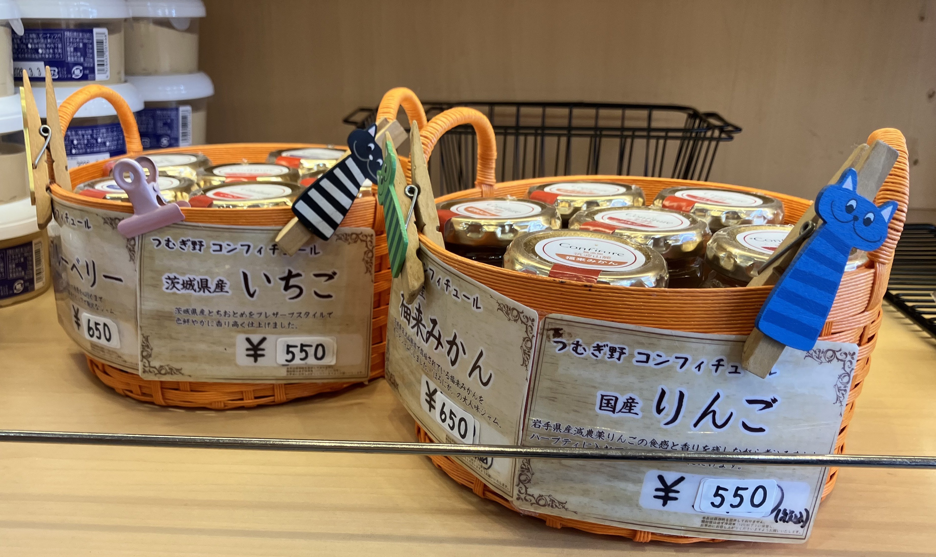 つむぎ野コンフィチュール ◆茨城県産いちご 550円(税込) 茨城県産とちおとめをプレザーブスタイルで 色鮮やかに香り高く仕上げました ◆茨城県産ブルーベリー 650円(税込) 茨城県産ブルーベリーの食感を心行くまで 楽しめるフルーツ本来のピュアで贅沢なジャム ◆国産りんご 550円(税込) 岩手県産減農薬りんごの食感と香りを残しながら 煮込みました。ハーブティーに入れても お楽しみいただけます。 ◆茨城県産福来みかん 650円(税込) 茨城県筑波山周辺で栽培されている 福来みかんを皮ごとジャムにしました。 “ほろにが”大人味ジャム。