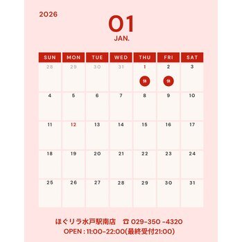 1月の営業カレンダーをお知らせいたします。