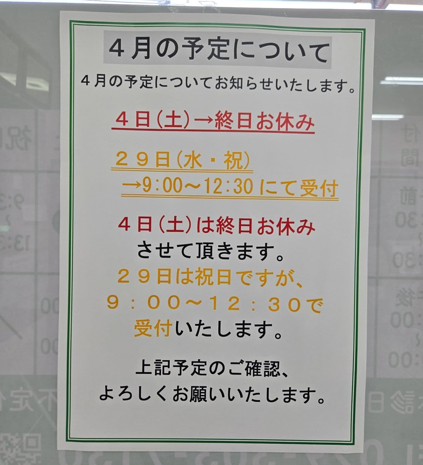 4月の予定及び受付時間変更についてお知らせいたします。