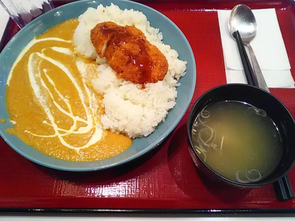 11月中旬の土曜夕、小腹を満たすために久しぶりに立ち寄りました。今回は「チキンカツカレーライス」をエビカレー(甘口)ベースで注文。カレーライス単品ですが、味噌汁(ワカメ/ネギ)が付きます。主皿のカレールゥは明るい黄土色で、具としては僅かに小エビが含まれるのみ。表面にはミルク(or生クリーム)で白い縞状の飾りが施されています。傍らのライス上には、ソースをかけた約11cm長x6cm幅のチキンカツ1個。カレーは甘口なので殆ど刺激なく食べ進められますが、辛味好きとしては物足りないかな。あっと言う間に完食でした。