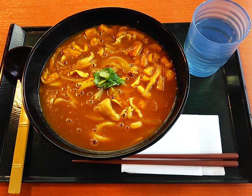 3連休直前の平日午後、暫くぶりに入浴で再訪。この間リニューアル工事があったようで、玄関入って直ぐの下駄箱が、100円玉を投ぜずに使用できるタイプに変わっていたり、洗い場も綺麗に一新されていました。それに伴ってか、残念ながら入浴料も上がっており、時流を感じさせます。それでも男湯は、特に人気の高濃度炭酸泉が混んでいるなど盛況です。ひと風呂浴びてから館内食事処「ゆらり亭」で「名物カレーうどん」を食しました。豚バラ肉やタマネギ、刻み揚げが入ったカレーかけ汁は全体に適度なとろみがあって熱々。丼中央には三つ葉がトッピングされており、味わうとあまり辛くなく、旨辛の部類です。身体の内部からも温まることができました。