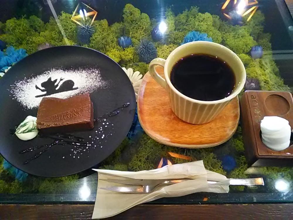 約3年半ぶり、今月下旬の土曜午後に再訪すると、ほぼ女子グループで活況を呈しています。初訪時と同様、店内は植物の緑に満ちており、着いたテーブルの上面に嵌め込んだガラス越しにドライフラワー(?)も見えます。ただ注文方法は時勢に乗って、モバイルオーダー(同時決済?)に変わってました。が、口頭注文(後払い)も受付けていたので、お得なスイーツセットメニューから「芳醇ショコラテリーヌ」のブレンドコーヒー(Hot)セットを注文。例の圧縮おしぼりのキットが初めに到来し、次いでスイーツプレートとコーヒーが到来しました。プレートは約6cm幅x4cm長x1cm厚のショコラテリーヌにマスカルポーネ(?)クリームが添えられ、シュガーパウダーで描いた動物絵や蜂蜜アート、岩塩粒が散らされた、なかなか凝ったものです。テリーヌはねっとり濃厚で生チョコレートのような食感でかなり美味しい。ブラックのブレンドとともにひと時を愉しめました。