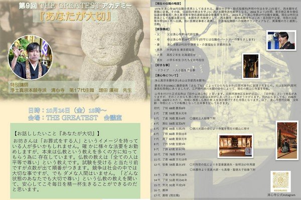 10月24日(金)18時から第9回THE GREATESTアカデミー“あなたが大切”を特別講師として浄土真宗本願寺派 清心寺 第17代住職 増田廣樹 先生 をお招きし、開催いたします!