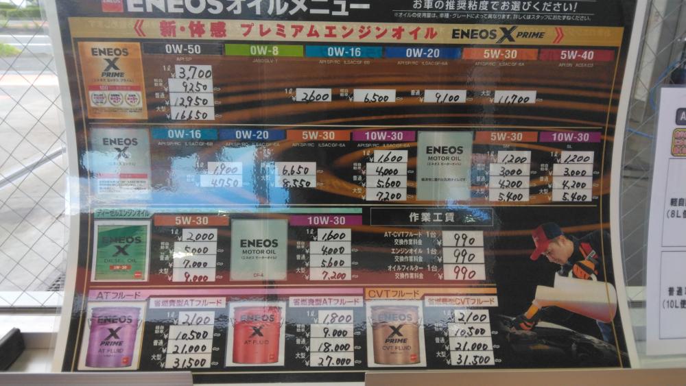 この日は給油で訪問。 そろそろオイル交換をしないとなと思ってたとこで、オイルの種類と値段表を発見しました。 これを見て、次に入れるオイルを決めようかと思います。