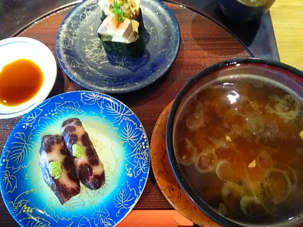 平日昼に再訪し、10月のおすすめ「かにマヨ軍艦」「なめこ汁」を中心にいただきました。ほぐした蟹の身をマヨネーズで和えた「かにマヨ軍艦」は滑らかな口当たりで、塩味・独特のコクもあって、かなり美味しい。なめこ汁はつくば産なめこを使っており、1本1本がかなり大粒。刻み万能ネギと刻み油揚げも加わり、とろみのある味噌汁が実に美味しいです。この他、昆布ちりめん軍艦や山芋泪巻き等で愉しみました。