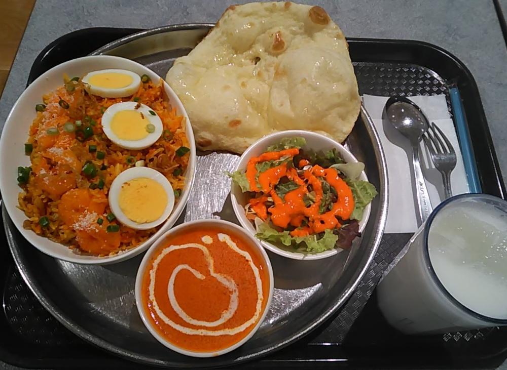 久しぶりに平日昼に再訪です。メニューにビリヤニも加わったことを知り、海老ビリヤニセットにプレーンラッシーを付けて注文。1種類選べるカレーとしては、8種類のカレー(バターチキン/ダル(豆)/エビ/キーマ/チキン/ほうれん草チキン/マトン/ブラックペッパー)から、バターチキンカレーを選びました。呼出しコールと引換えに受け取ったステンレスプレートには、メイン皿に入った海老ビリヤニ(海老5尾・固茹で卵スライス3枚トッピング)、小鉢に入ったバターチキンカレー(白クリーム回しがけ)、差渡し約15cmx15cmの比較的小さなプレーンナン1枚、それにサラダ小鉢(サニーレタス/キャベツ/人参/橙色の人参ドレ)が載っています。ビリヤニはパラッとした長粒種米に刻み万能ネギ・フライドオニオンが絡み、塩・スパイスによる味付け、トッピングの海老でなかなか美味しい。ゴロッとした鶏肉が入っているバターチキンカレーは甘く、殆ど辛さを感じません。やはり辛さを追求した方が良かったかな。ナンは熱々ではなく温め。ラッシーもちょっと甘過ぎました。