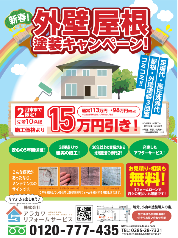 荒川塗工では、高耐久・遮熱塗料など豊富なリフォームプランをご用意。小山を拠点に茨城県西エリアでも多数の施工実績あり。お気軽にご相談ください。