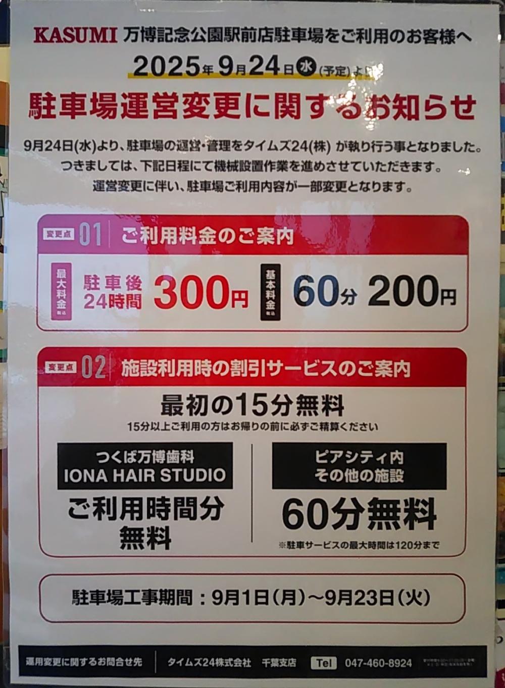 普段遣いの食材購入で利用しているスーパー・カスミ。10月のある日、久しぶりにこちらのお店を訪れてみると、敷地入口に車輛監視カメラが設置されているなど、風景の変化に気付きました。店内に掲出されたポスター告知によれば、今まで無料だった駐車場が、前月9月24日より有料駐車場になったとのこと。これに伴い、店前には精算機も設置されていました。TXみどりの駅近くのカスミ・ライフガーデンみどりの店では、オープン当初より類似の有料駐車システムを導入してましたが、こちらのお店にも遅ればせながらそんな波が来たかと、思わずため息です。「最初の15分無料」ですが、利用時間が長ければ精算が必要なので、ちょっと手間でもあるなと感じます。敷地内の混雑緩和等に役立てば良いのですが。
