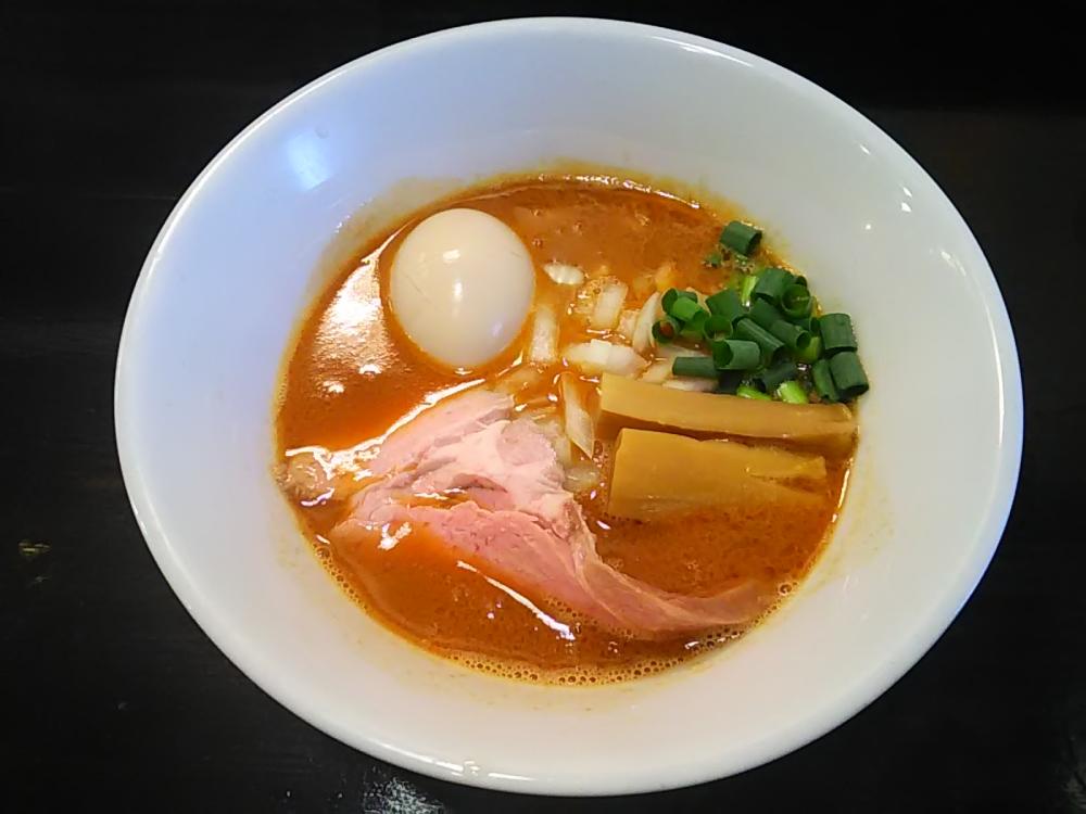 今月上旬の平日昼に久しぶりに再訪です。入口脇の黒板に、数量限定メニュー「えびそば」が出ていたので、今回はこれを選択。限定メニューなので大盛不可であり、また他メニューでは3種の麺(ストレート/パツパツ/手揉み)から選べるところ、これはストレート麺(150g)一択とのこと。なお叉焼は選択可能で、豚バラあるいは低温調理の豚肩ロースから、肩ロースを選ぶとともに、クーポンによる無料味玉も加えてもらいました。卓子席は全て塞がり、カウンター席には前客2人という盛況。カウンター席に着いて10分程で提供されました。鶏白湯と海老スープをかけ合わせた、暗橙色で濃厚なスープにストレートの中細麺が浸っています。海老独特の香りが薫り、味わい良く実に美味しい。麺上の具は、低温調理でレア感のある約5mm厚の豚肩ロース叉焼1枚、刻みタマネギ、刻み万能ネギに太メンマ。追加の味玉は黄身が流れ出す仕上がり。あっと言う間に完食完飲となりました。
