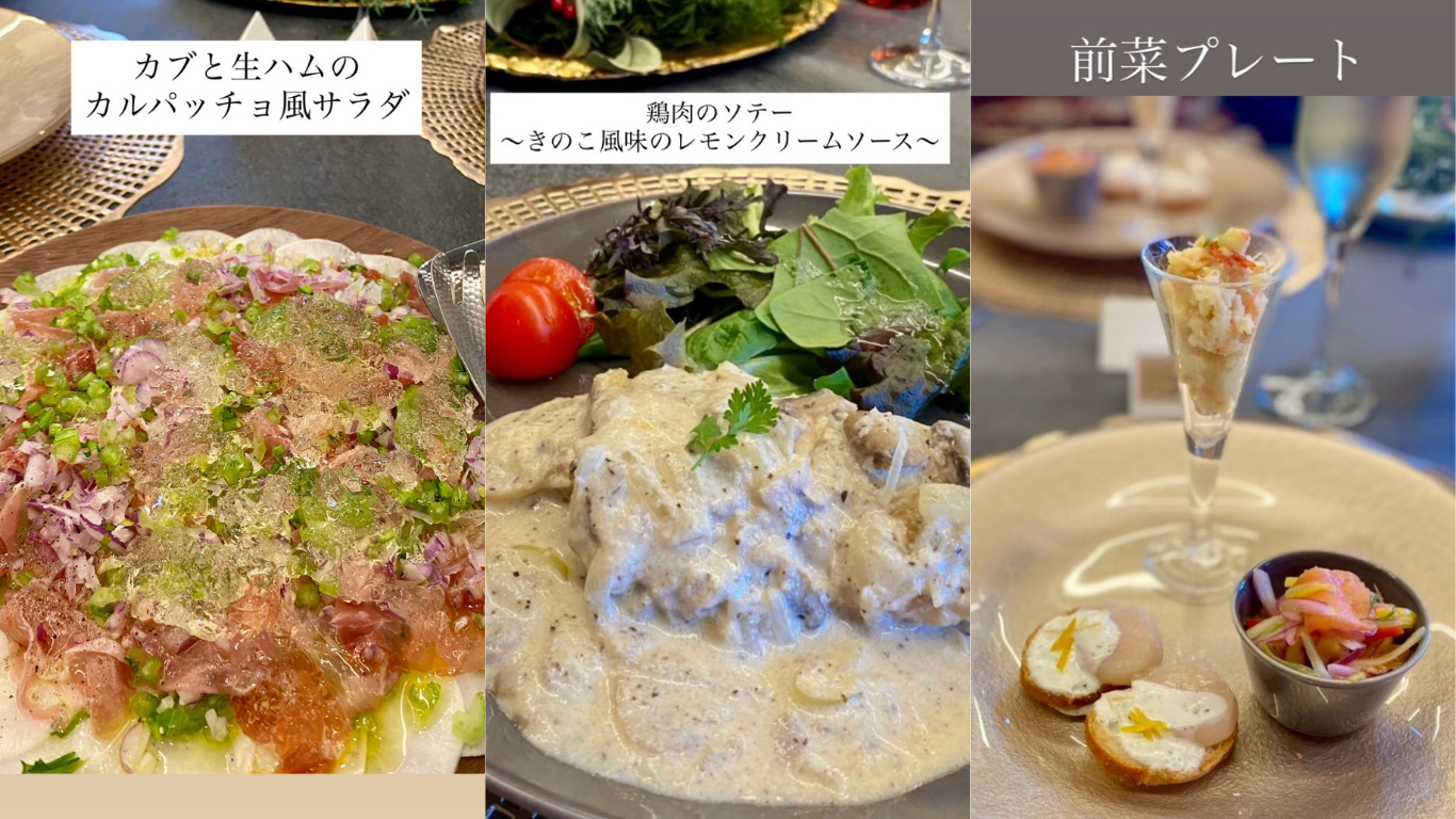 魚介を使った前菜プレート、メインのお肉、デザートのコース仕立ての料理でクリスマスパーティ気分で楽しめるレッスンにと考えています