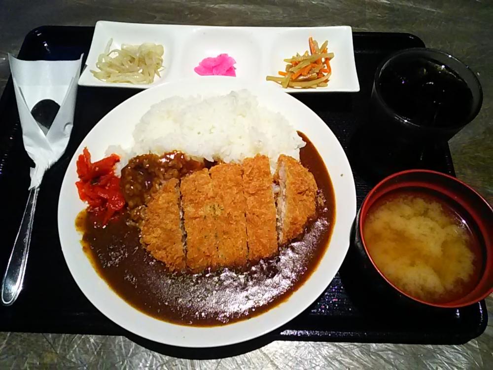 また久しぶりに平日昼に再訪。相変わらず盛況で店内は混んでいます。今回は9月になっても続く暑さに抗するため、人気の日替わり定食でなく、レギュラー定食のカツカレー(ドリンクバー付)を選択。今どき奇特なご飯大盛無料にも惹かれ、大盛仕様にしてもらいました。今回は以前に通された畳敷きの洋卓席でなく、板敷の掘炬燵席へ。セルフのドリンクバー(コーラ、ホット/アイスコーヒー等)で喉を潤しつつ、待つこと10分程度で平膳到来。大きな丸皿に盛られたカレーライス上に約14cm長x8cm幅の豚カツがトッピングされ、カレールゥ上にはパセリ粉が散らされてます(赤福神漬添え)。これに味噌汁(ワカメ/タマネギ)と漬物の三品皿(塩茹でもやし/ダイコン桜漬/キンピラゴボウ)が付きます。カレールゥ内には具が見当たりませんが、コクと旨味それに適度な辛さがあって、かなり美味しい。大盛ご飯で満腹です。口直しにホットコーヒーで〆。