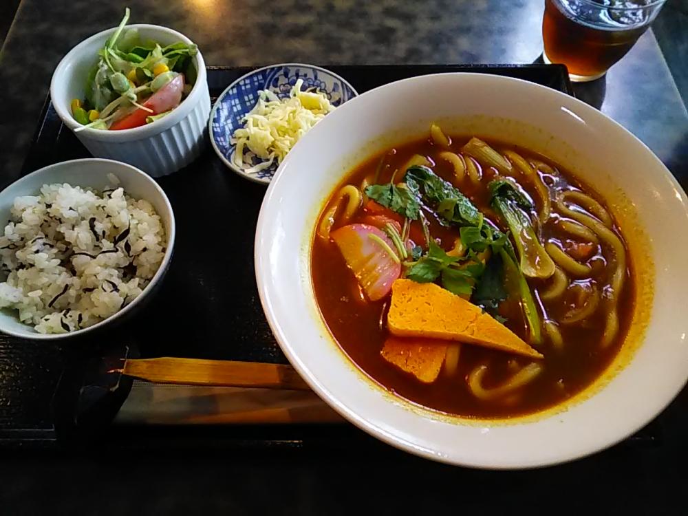 通りかかる度に気になっていた和カフェですが、10月中旬の日曜昼に初めて立ち寄りました。店頭のショーケースには看板商品の「おはぐろ団子」はじめ種々の甘味が並び、直売されています。甘味は後日に廻すとして、ランチで店内奥の食事処へ。前客1組で落ち着いた雰囲気。創作料理主体のような季節のランチメニューがあり、今回はそのうちの「チーズカレー南蛮うどんと梅ひじきごはん(サラダ付)」を注文しました。到来した平膳にはカレー南蛮うどん(別皿にとろけるチーズ)、小茶碗盛りの梅ひじきごはん、それにミニサラダ(レタス/ベビーリーフ/トマト/カイワレ/枝豆/コーン/フレンチドレ)。カレー南蛮うどんは稲庭うどん使用で、特徴的なツルシコ食感。うどんの具は豚肉・青梗菜・長ネギ・タマネギ・ニンジン・カマボコ・厚焼玉子・三つ葉。これに別皿のとろけるチーズを投入して混ぜ溶かすと、カレーつゆの辛さがマイルド化、コクも加わり、なかなかに美味しい。また香り良い三つ葉の味わいが鮮烈です。梅ひじきごはんは刻み梅干しとひじきが混ぜ込んであり、梅干し由来の仄かな塩味でこれも美味しい。小茶碗のため少量なのが惜しいところ。いずれも美味しく完食です。次回は団子等の甘味も味わってみたいです。
