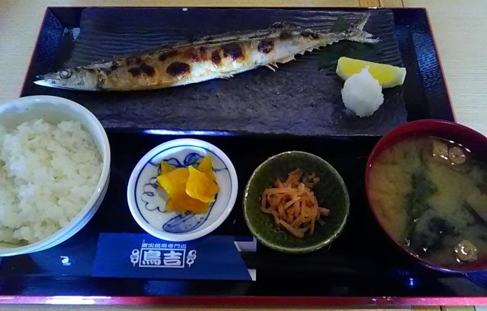 久しぶりに平日昼に連れと再訪すると、お得な「日替りランチ」と「チキンカツ定食」が、この9月より提供終了となり、今後は通常ランチメニューと期間限定定食で営業する旨の残念な掲示がありました。それでも店内はほぼ満席と盛況で、玄関土間で暫く待機。卓子席に着いてから、今が旬であろう限定メニュー「秋刀魚塩焼き定食」を注文しました(連れはいつもの焼魚(サーモン味噌漬)定食を注文)。到来した平膳のメインは約30cm長の秋刀魚塩焼き(大根おろし・カットレモン添え)。これに切干し大根煮とタクアン、並盛ご飯と味噌汁(ワカメ/豆腐/巻き麩)が付きます。さすがに秋刀魚は脂がのっていて美味しいですが、以前の定食内容に比べると小鉢等の皿数も減っており、これもご時世かと思った次第です。