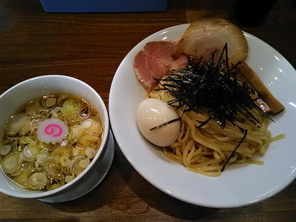 11月中旬の平日昼に再訪。今回は未食だった「いづるつけそば」をクーポン味玉付きでいただきました。到来した麺丼には全粒粉使用の太麺が盛られ、約3mm厚の豚バラ叉焼・豚ロース叉焼1枚ずつ、太メンマ、切海苔、クーポン味玉1個がトッピングされています。つけ汁小鉢には鶏出汁醤油ベースの熱々つけ汁。、ナルト1枚にたっぷりの刻みネギが浮いています。つけ麺系は普段は殆ど食さない自分ですが、これは実に美味しいため食が進み、あっという間に完食。割スープももらってつけ汁も完飲となりました。