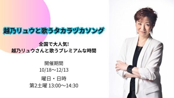宝塚歌劇の男役として、また史上最年少の月組組長として、多くのファンを魅了した越乃リュウさんと、ファンおなじみの名曲を歌いましょう!タカラヅカ流ウォーミングアップもたっぷりと時間をとって紹介。憧れのタカラジェンヌに近づきます。
