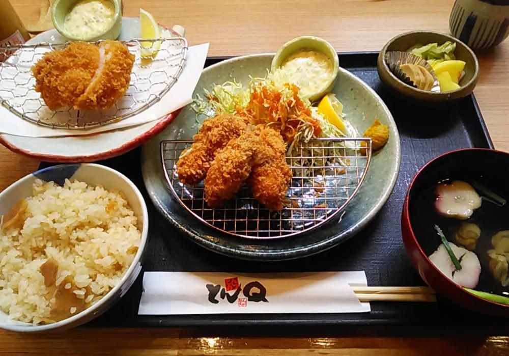 今月上旬の平日昼、かなり久しぶりに再訪すると、相変わらずの盛況です。カウンター席に着くと、注文方式は卓上タッチパネルによるものに変わってました(注文後、初めに白ゴマ入りの擂鉢・擂粉木が到来するのは変わらずでが・・)。メニューはバラエティがあって迷いますが、結局、今が旬の広島産カキを使った「海老かつ&カキフライ定食」を選びます。ご飯は新潟産コシヒカリor季節のご飯(生姜とわかさぎ炊き込みご飯)、味噌汁は特製とん汁or季節の味噌汁(アズマニシキ(ホタテの仲間)のお吸い物)がラインアップされており、それぞれ季節物の方を注文しました。待つこと15分程で平膳到来(海老かつは造り直しになったとのことで、別皿での後出し)。メイン皿には約8cm長と大ぶりのカキフライ3個が載り、千切りキャベツ、カットレモン、タルタルソースが添えられています。なおカキフライ用に開発したという特製ハーブ塩「スパイシーピンクソルト」も勧められたので、タルタルだけでなくハーブ塩も試しました。いずれにしてもカキ特有の旨味と食感が愉しめます。後出しの海老かつ(カットレモン・タルタルソース添え)は約10cm径と意外に大きい揚げ(2枚切り)。プリプリ食感と特有の甘みがあって美味しい。生姜とわかさぎの炊き込みご飯は味が良く、アズマニシキのお吸い物は上品で旨味ある塩汁でした。なお、この日の香の物はタクアン・白菜浅漬、山芋醤油漬。炊き込みご飯と千切りキャベツをお替わりして満腹となりました。
