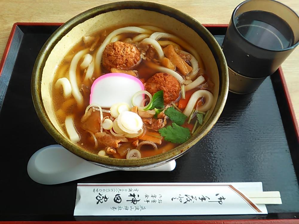筑波山神社への初詣から帰る途中、遅い昼食を摂ろうとして再訪。筑波山名物として知られる「つくばうどん」をこちらでも提供しているので、初めてこれをいただきました。「つくばうどん」はつくば茜鶏の「つ」くね、地元の「く」ろ野菜(ゴボウ・椎茸)、県銘柄豚ローズポークの「ば」ら肉をそれぞれ入れた、筑波山のご当地うどんです。実食したうどんには、これらの具のほか、カマボコ・ジャガイモ・ニンジン・大根・刻み揚げ・三ッ葉・刻みネギも入っていました。また麺は霞ヶ浦産レンコン粉を地元産小麦粉に練り込んだレンコン麺とのこと。温かな醤油出汁のつゆは結構甘く、けんちん汁の様に味わえるとともに、完食完飲で身体も温まりました。