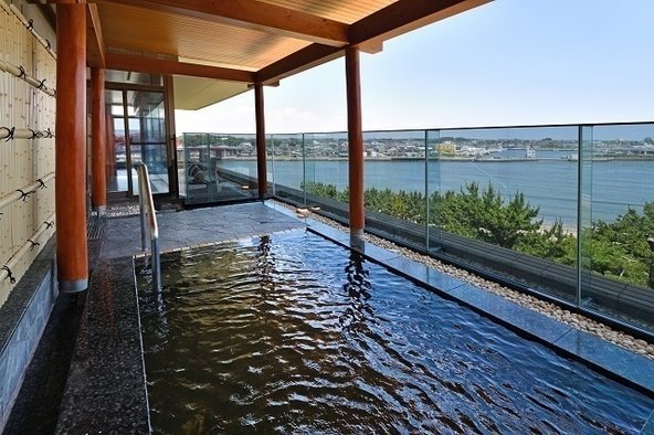 石造りの大浴場。 露天風呂からは海門橋と大海原を展望でき、波の音色と風のささやきが心地よく響きます。 静寂の中で過ごす非日常の時間をお楽しみください。