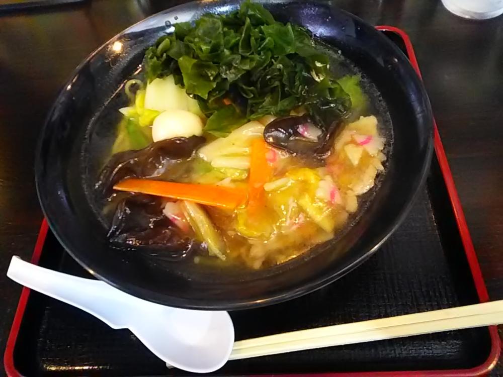 10月下旬の日曜昼に久しぶりに再訪。8割方の客入りで賑わっています。今回もあっさりしてそうな「塩あんかけラーメン」を注文し、トッピングクーポンでワカメを追加しました。麺はツルモチッとした多加水中細麺で、透き通った黄金色の塩清湯に浸っています。麺上のあんかけは、ウズラ茹で卵2個・豚肉・刻みナルト・もやし・ピーマン・木耳・白菜・ニンジンが餡で閉じられたもの。また追加のワカメもたっぷりで、ゴマ油の香りがとても良いです。熱々のあんかけで身体も自然、温まります。鶏ガラ・豚骨出汁の旨味を存分に味わいました。