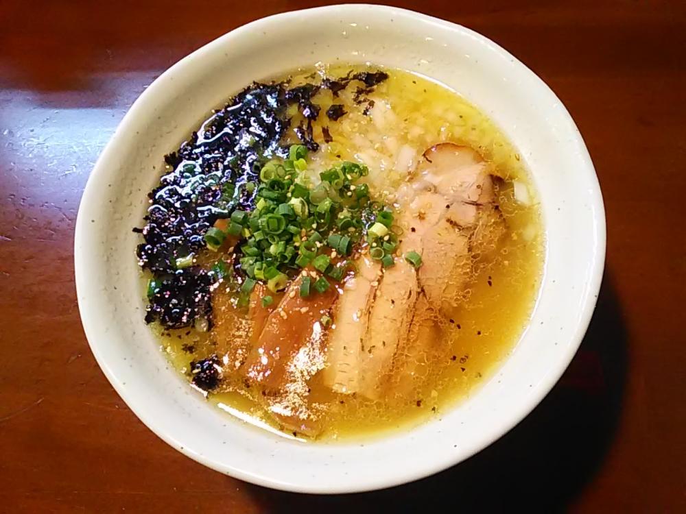 「敬老の日」の夕方、久しぶりに立ち寄りました。卓子席・小上がり席はほぼ満席という盛況。カウンター席に着き、眼前の掲示メニュー写真で目立つ「鶏油香る塩らーめん」を注文しました。到来したラーメンは縮れ中細麺で、熱々鶏油の浮く黄金色の塩清湯に浸っています。麺上の具は炙った豚バラ叉焼(厚さ約5mm)、刻みタマネギ、岩海苔、メンマに刻み青ネギ。丁寧に炊き上げたという鶏ガラと豚骨の合わせ出汁が絶妙で実に美味しい。叉焼も相変わらず美味しく、あっという間に完食でした。