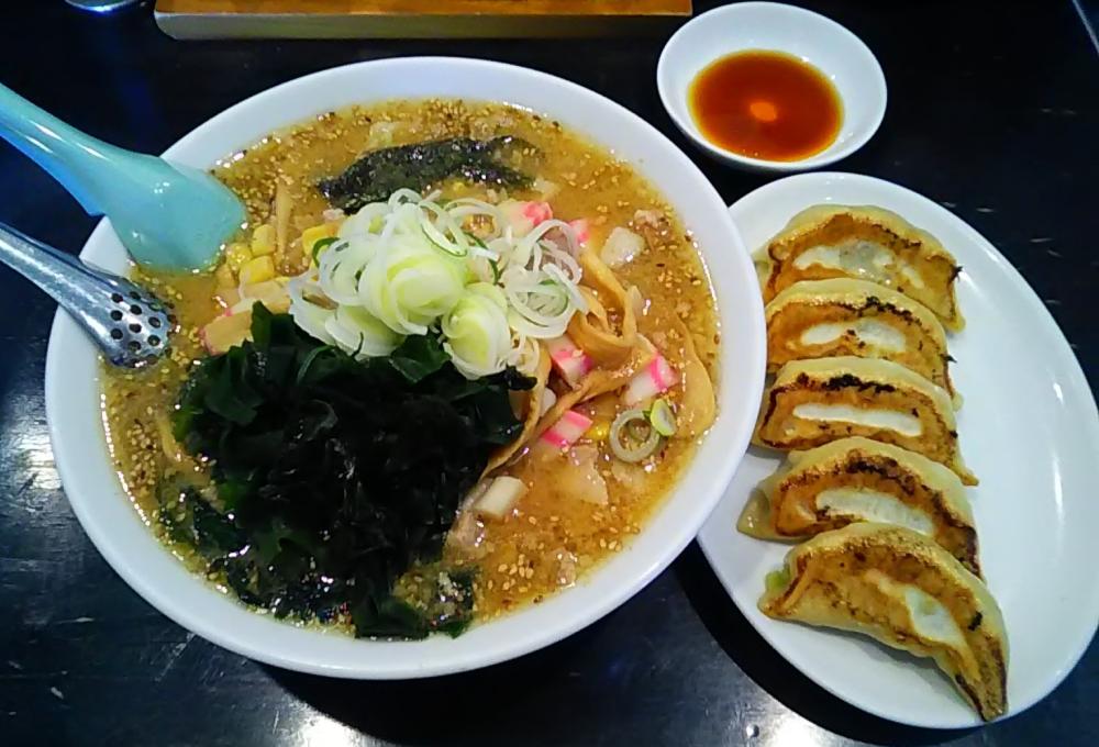 日曜夜にまた久しぶりに再訪。卓子席や小上がり席は満席で、カウンター席のみが空く盛況さです。カウンターの隣席間には仕切り設置の対策もされていました。今回は未食の味噌ラーメンと焼餃子(5粒)を注文。味噌ラーメンは白味噌仕立てなのかあまり赤くない味噌スープに、自家製の不揃いツルツル縮れ麺が浸っています。スープはマイルドな甘さがあって美味しい。具は約3~4mm厚の豚ロース叉焼1枚に角切り叉焼数個、炒めた豚挽肉、板海苔1枚、ナルト1枚、メンマ、刻み白ネギにコーン。白黒ゴマが結構浮いています。焼餃子も自家製のようでやや大きめ。餡肉に黒胡椒が練り込んであるのか、独特の刺激のあるのが特徴的。いずれも価格的に廉価な設定であるのも良いです。