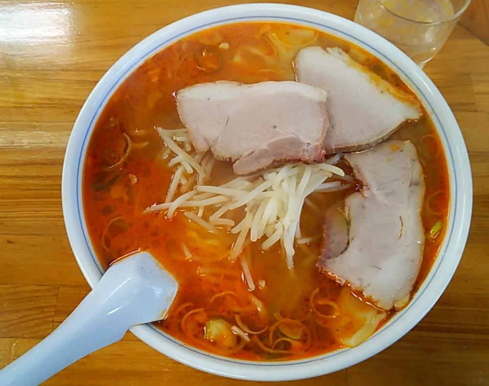 祝日昼に久しぶりに再訪しました。相変わらずほぼ満席で、カウンター隅の一つのみの空席に案内されます。以前の来訪時には消えていた味噌系が復活していたので、今回は初めて「みそワンタン麺(大)」を注文。到来した丼は大きいです。自家製手打ち中太麺250gほどがサラッとした味噌スープに浸り、スープ表面には橙色の辣油系ピリ辛が浮いています。麺上の具は約3mm厚の豚ロース叉焼3枚、ツルッとしたワンタン皮(肉無し)6枚ほど、野菜類としては茹でもやしと刻みネギのみ。麺はやはりかなり柔らか。スープは味噌が薄めのためかあっさり、鶏ガラ出汁の旨みを感じるとともにピリ辛の刺激も相俟って、なかなか美味しい。大盛の麺とたっぷりのスープで満腹となりました。