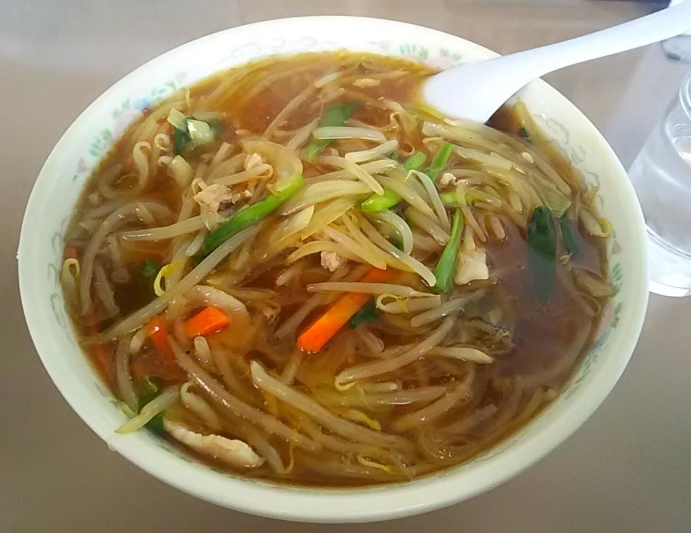 今月下旬の平日昼、約2年半ぶりに再訪しました。席の半数程度は前客で埋まっている盛況です。冬限定メニュー「もやし餡掛けラーメン」を注文。カウンター席で待つこと20分程度でラーメン到来。たっぷりのもやし餡が丼表面を覆い尽くしており、餡の下に隠れた麺は中細麺で、醤油ベースの清湯に浸っています。もやし餡にはメインのもやし以外に玉ネギ・人参・豚バラ肉が含まれています。麺・清湯ともに量はたっぷりで満腹となり、また熱々の清湯で身体も温まりました。