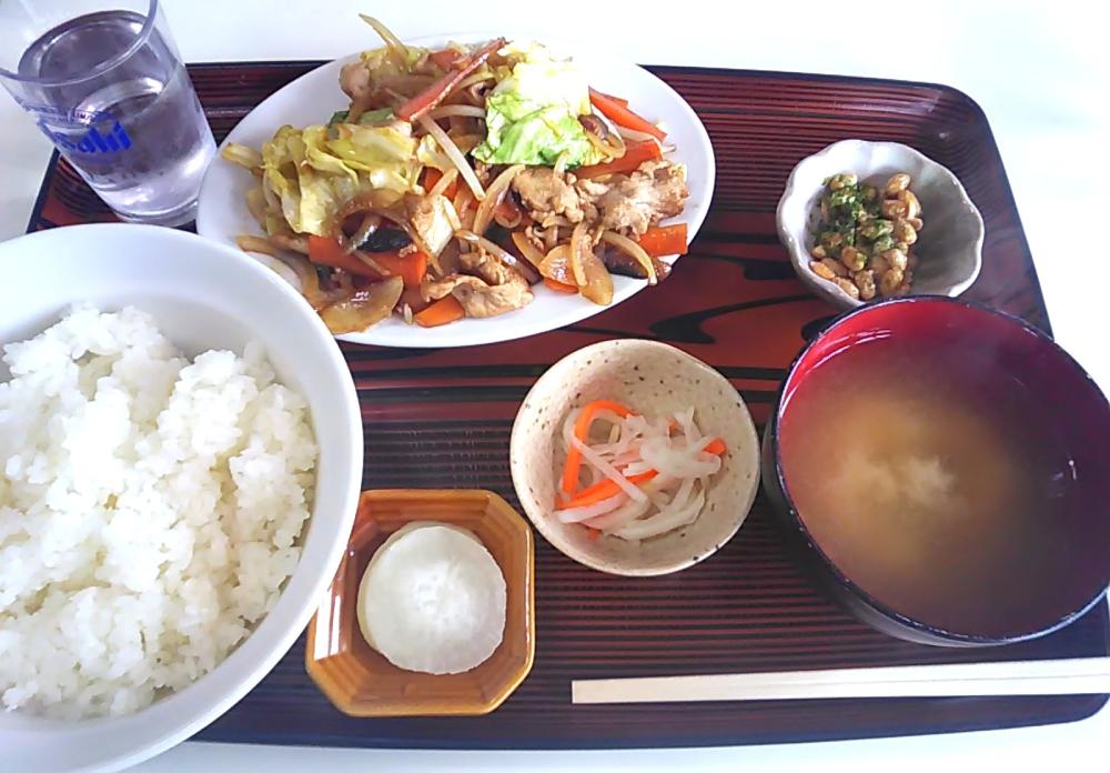 約2年半ぶり、今月の平日昼に再訪すると前客5人ほど。今回は初めて定食メニューを試すべく、肉野菜炒め定食を注文しました。到来した平膳にはメインの肉野菜炒め(豚肉/キャベツ/もやし/タマネギ/ニンジン/椎茸)のほか、小皿入りのミニ納豆(青海苔がけ)と紅白なます(ニンジン/大根の酢の物)、タクアン、たっぷり盛りの良い丼飯、それに味噌汁(豆腐/ワカメ)が陳んでいます。肉野菜炒めは普通に美味しく、たっぷり御飯で十分満足しました。