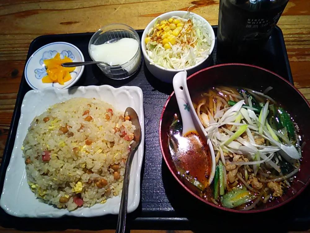 10月下旬の平日昼、かなり久しぶりに再訪です。店内は場所柄、多くの学生さんで賑わっています。週替わりランチメニューは10種類と豊富で目移りしますが、今回は一風変わった「納豆炒飯&ラーメン(ドリンク付)」を。ラーメンのスープは塩、四川、担々、味噌、醤油から選べ、今回は四川ラーメンを選びました。またドリンクは6種類よりアイスコーヒーを。到来した平膳には平皿に盛られた納豆炒飯、やや小ぶりな丼の四川ラーメン、それにミニサラダ(キャベツ/ダイコン/ニンジン/コーン/中華ドレ)、タクアン、杏仁豆腐、意外に大きいグラスに入ったアイスコーヒーが載っています。珍しい納豆炒飯は、卵と刻みハム・ネギと言った通例の炒飯の具のほかに納豆が加わり、その特有の塩気とほんのりとした旨味で結構イケます。四川ラーメンは中細麺が唐辛子の浮く醤油ベースの清湯に浸るもので、麺上の具は豚挽肉炒め・白ネギ・もやし・小松菜。辛いが美味い。炒飯とラーメン、それに食後のたっぷりのアイスコーヒーで満腹となりました。